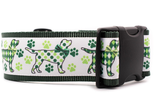 Embrace spring with the Irish Paws collar! This festive collar features a green nylon, adorned with a playful green pattern. You'll find adorable paw prints and playful dog silhouettes, each sporting a green polka dot or argyle pattern.