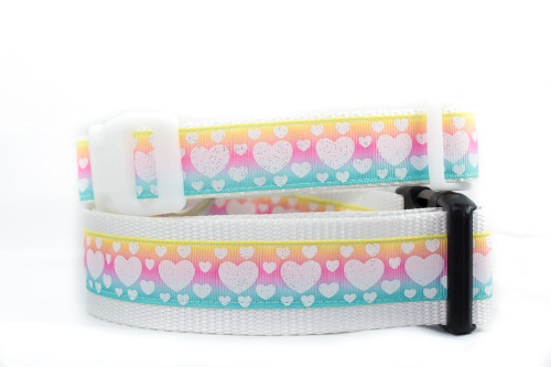 Beautiful pastel dog collar with an explosion of white glittery hearts and a yellow, pink, and blue pastel rainbow. Cute Valentine's Day collar!