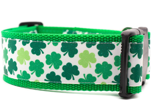 Festive St. Patrick's Day, Irish and spring themed collar with multi-shaded green shamrocks on a 2 inch wide kelly green nylon.