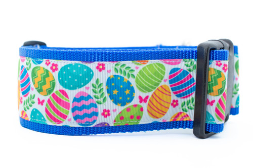 Bring a burst of springtime cheer with this collar. Featuring a playful pattern of multi-colored Easter eggs nestled amongst green ferns, flowers and butterflies.